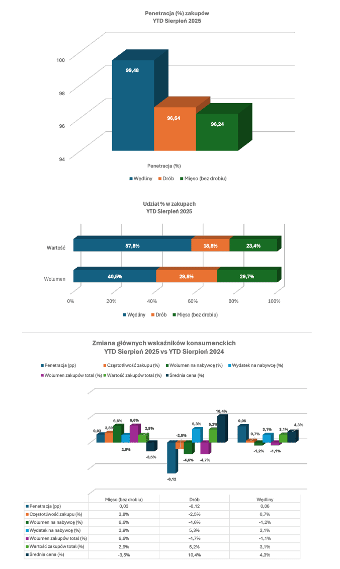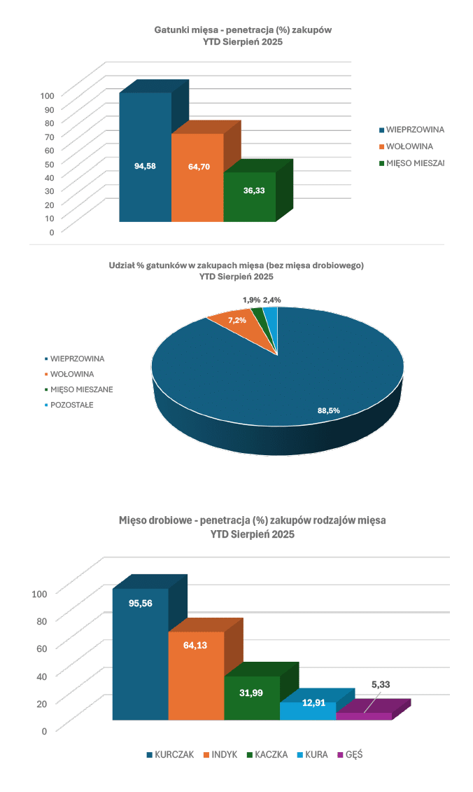 W czasie pierwszych ośmiu miesięcy bieżącego roku mięso – w tym mięso drobiowe – oraz wędliny znalazły się w koszyku zakupowym ponad 99,6% polskich gospodarstw domowych. W ciągu tego czasu każde z nich dokonało zakupu kategorii ponad 102 razy, a zatem była kupowana prawie 3 razy w ciągu każdego tygodnia. Przeciętnie każde z kupujących gospodarstw domowych zakupiło 125 kg mięsa i wędlin i wydało na te zakupy ponad 2.700 PLN. Łącznie w okresie styczeń – sierpień 2025 polskie gospodarstwa domowe kupiły ponad 1.745 tys. ton produktów mięsnych za kwotę ponad 37,7 mld PLN.