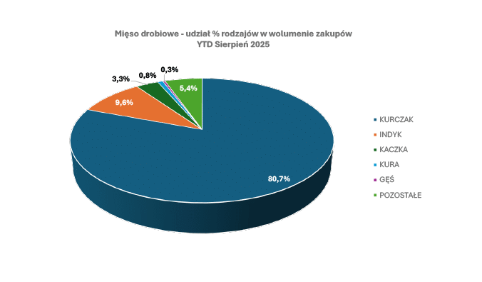 W kategorii mięsa drobiowego zdecydowanie dominuje kurczak, którego kupiło prawie 96% gospodarstw domowych i który odpowiada za prawie 81% wolumenu zakupów mięsa drobiowego w okresie styczeń – sierpień 2025. Drugie miejsce zajmuje indyk, który został kupiony przez prawie 65% nabywców i odpowiada za pokrycie prawie 10% zapotrzebowania na mięso drobiowe (udział w wolumenie zakupów). Trzecią pozycję w rankingu zajmuje mięso kacze z udziałami nieco ponad 3%, kupowane przez prawie 1/3 polskich gospodarstw domowych (penetracja zakupów na poziomie 32%).